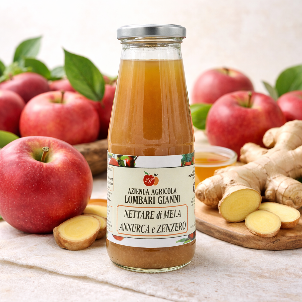 Lasciati conquistare dal Nettare di Mela Annurca e Zenzero dell’Azienda Agricola Lombari: un incontro perfetto tra la dolcezza della “Regina delle Mele” e la nota vivace dello zenzero. Ideale per chi cerca una bevanda dissetante e rigenerante, il nostro nettare porta nel tuo bicchiere la purezza della filiera corta italiana.